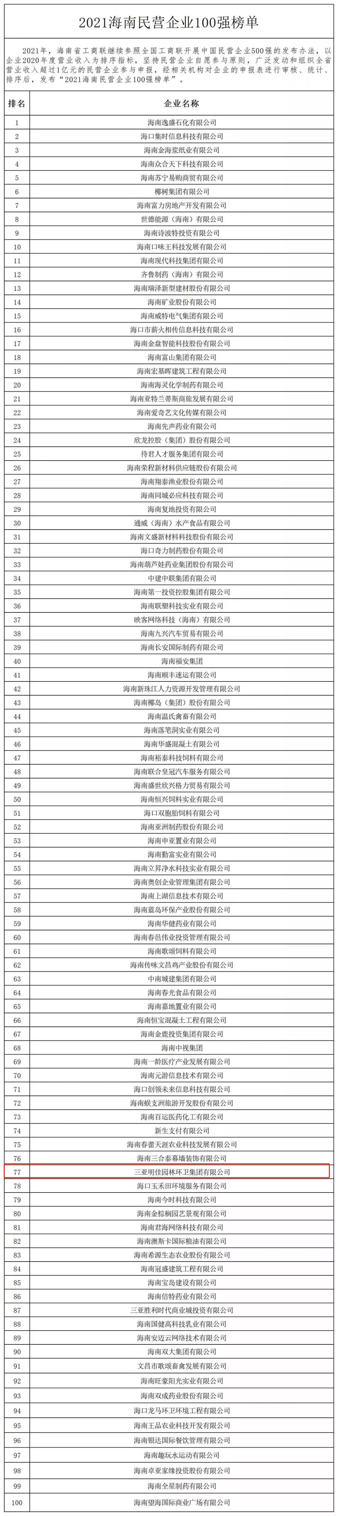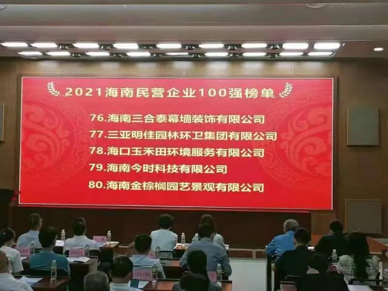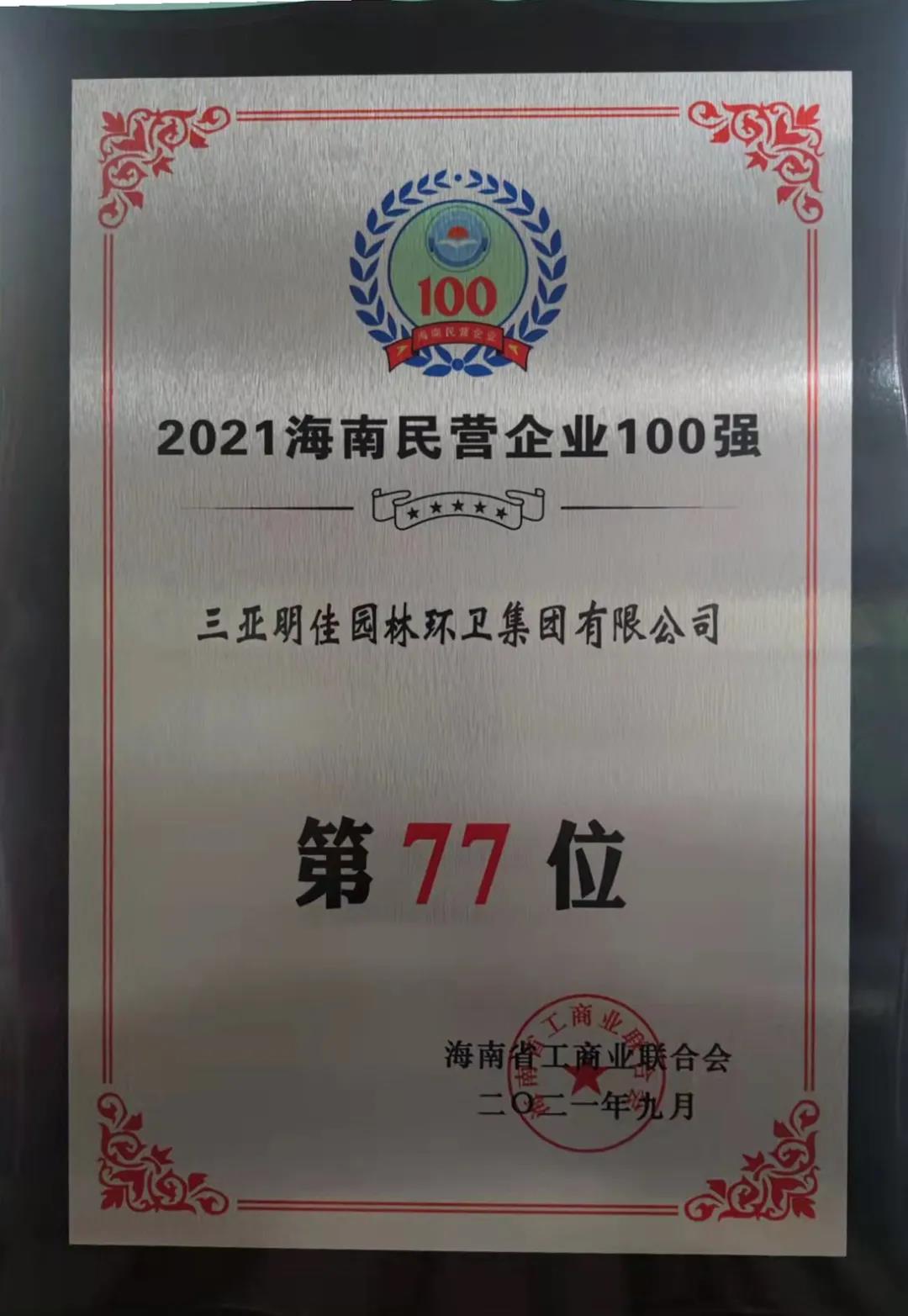 11月4日,海南省工商業(yè)聯(lián)合會在海口發(fā)布“2021海南民營企業(yè)100強”榜單。三亞明佳園林環(huán)衛(wèi)集團有限公司2019至2021年連續(xù)三年入選海南民營企業(yè)100強。